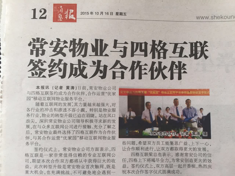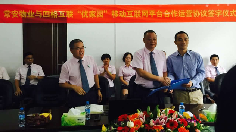2015年10月10日上午于公司會議室與四格互聯(lián)進行了合作簽字儀式。儀式上,張武董事長表示,四格互聯(lián)是一家非常值得信賴的專業(yè)互聯(lián)網(wǎng)公司,本次合作雙方都將從合作中獲得巨大的收益。公司由于是首次進行此類轉型,將不可避免地遇到各種困難,希望雙方員工能集思廣益、上下一心,讓合作順利進行,讓雙方都取得更大的發(fā)展。四格互聯(lián)的梁總表示,感謝常安公司的信任,物業(yè)方面常安是專家,希望得到常安更多的指導,四格上下將竭盡全力,為常安創(chuàng)造更大的效益。張總和梁總簽字之后一起開香檳,熱烈慶祝本次合作簽字儀式的圓滿成功。